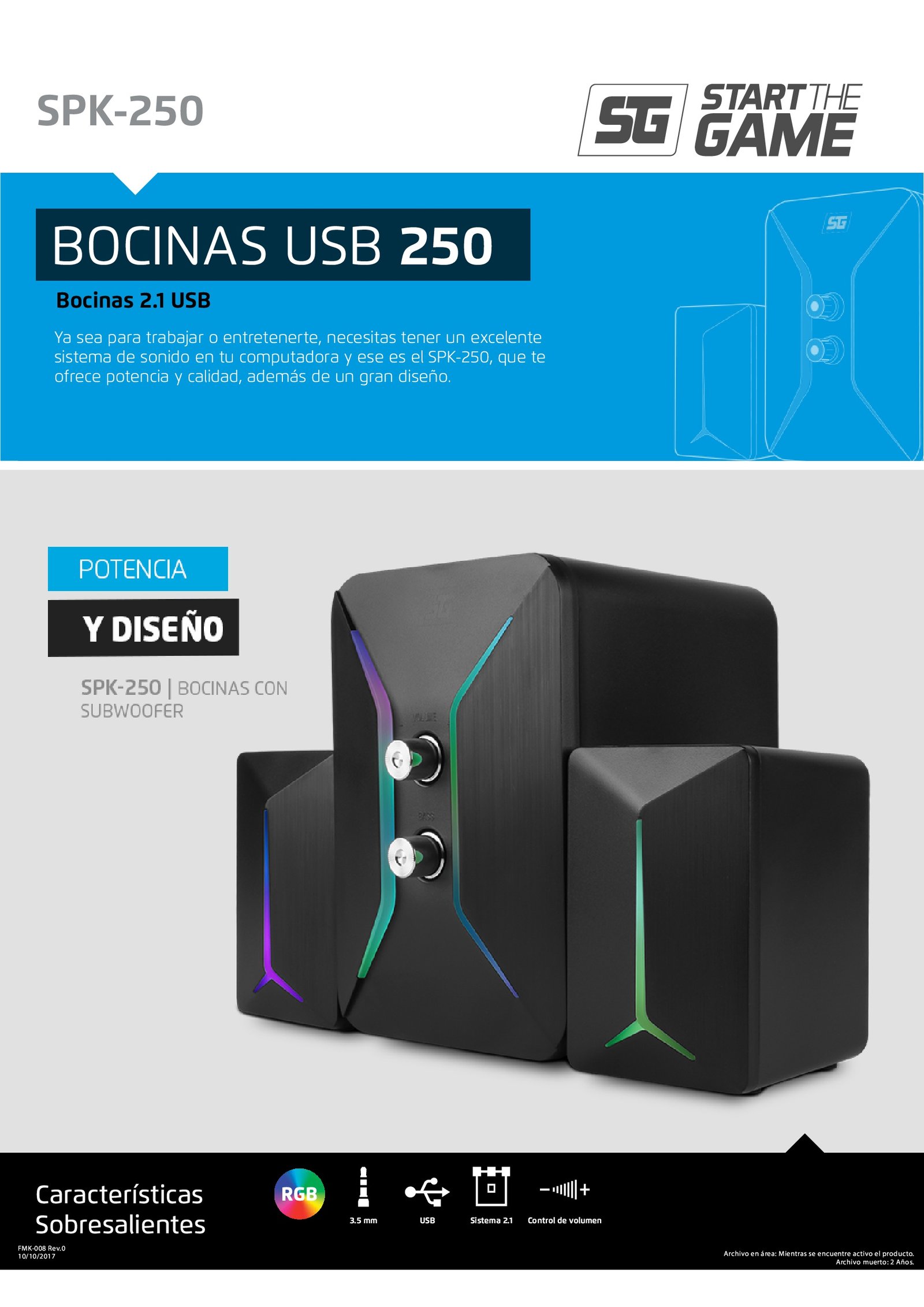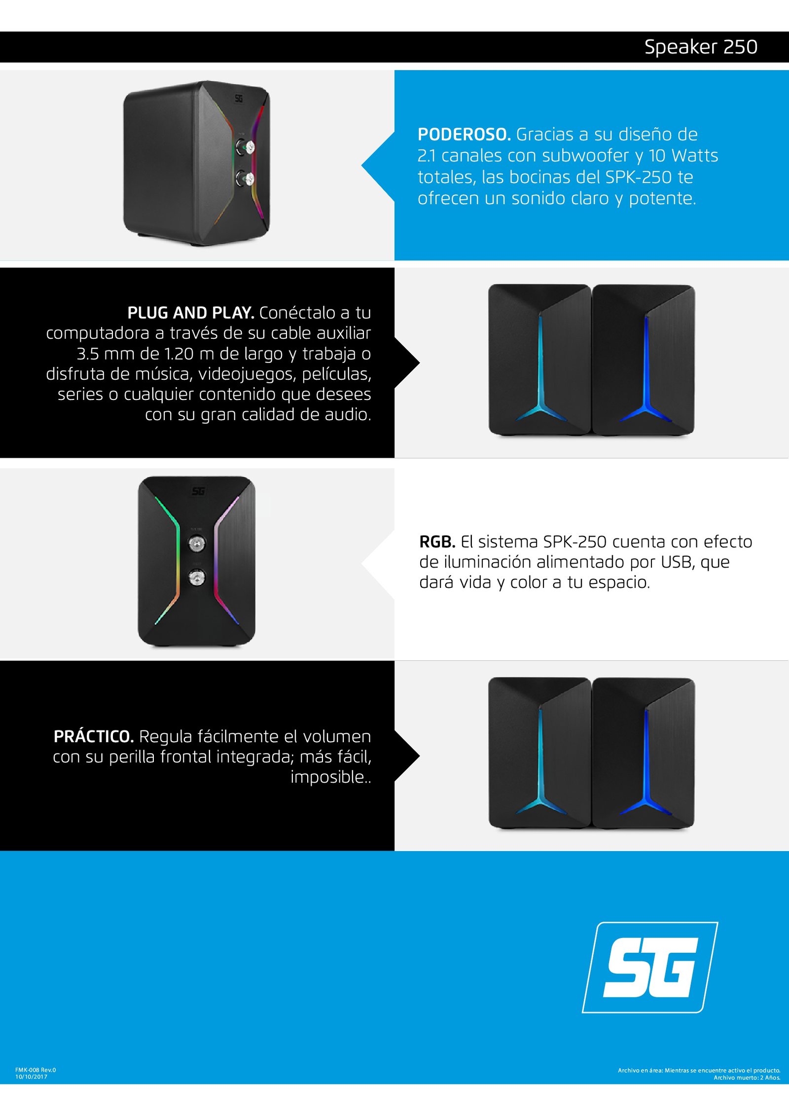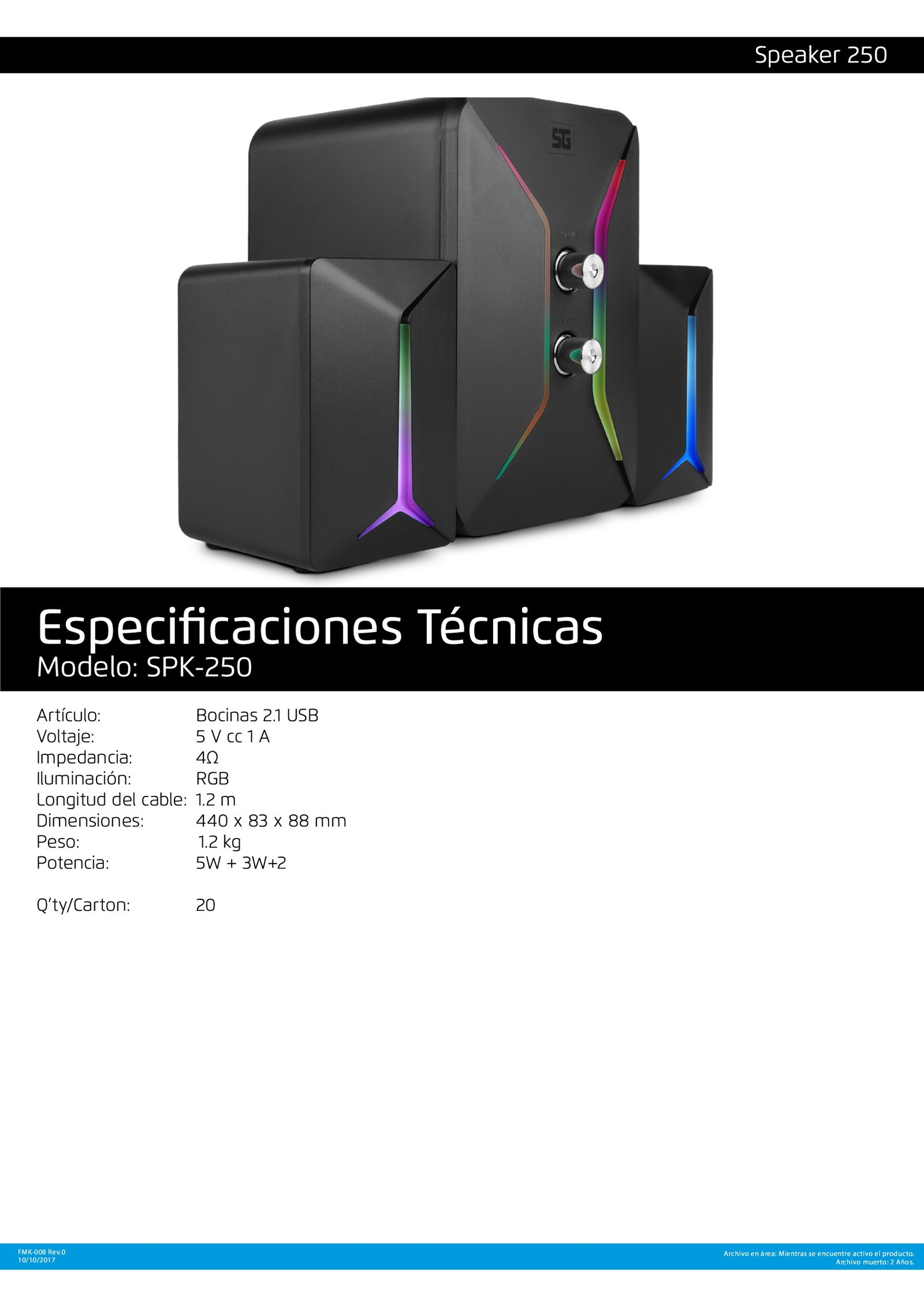 •  RGB. El sistema SPK-250 cuenta con efecto de iluminación alimentado por USB, que dará vida y color a tu espacio.
