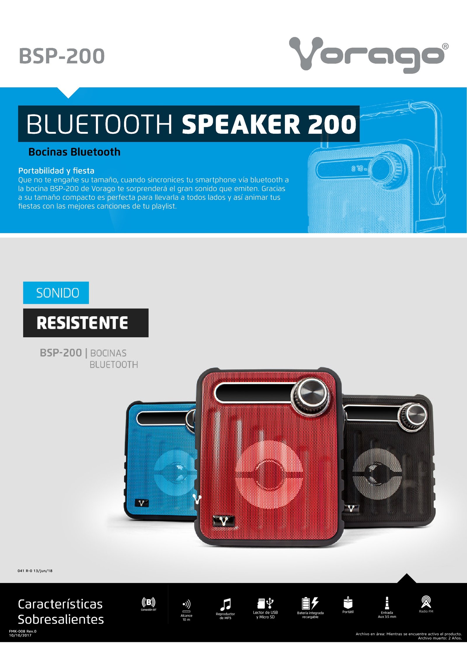 Bocinas Vorago BSP-200 bluetooth recargable MSD/USB/3.5mm azul