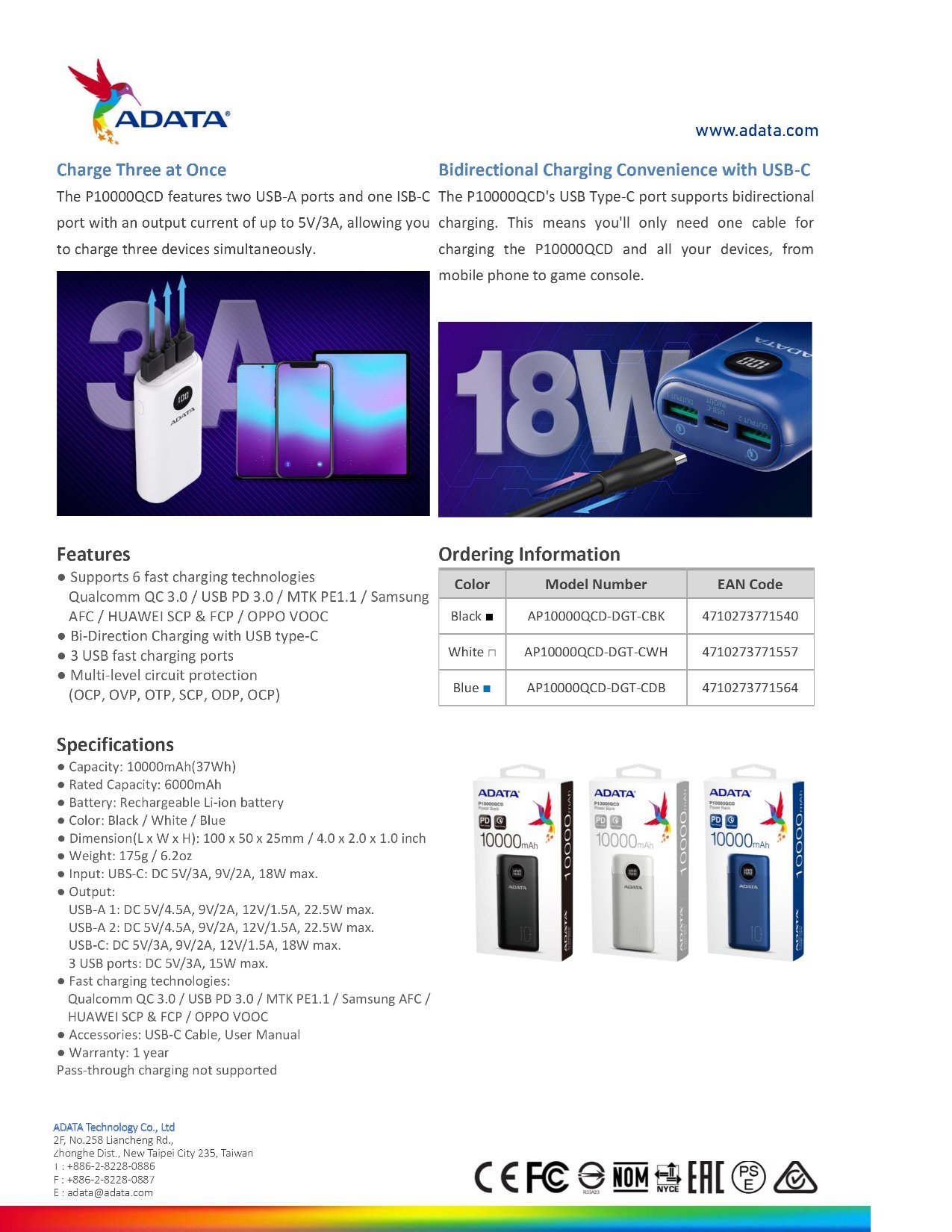 Cargador Portátil Adata P10000QCD- 10.000mAh- Blanco Power Bank CARGA RAPIDA