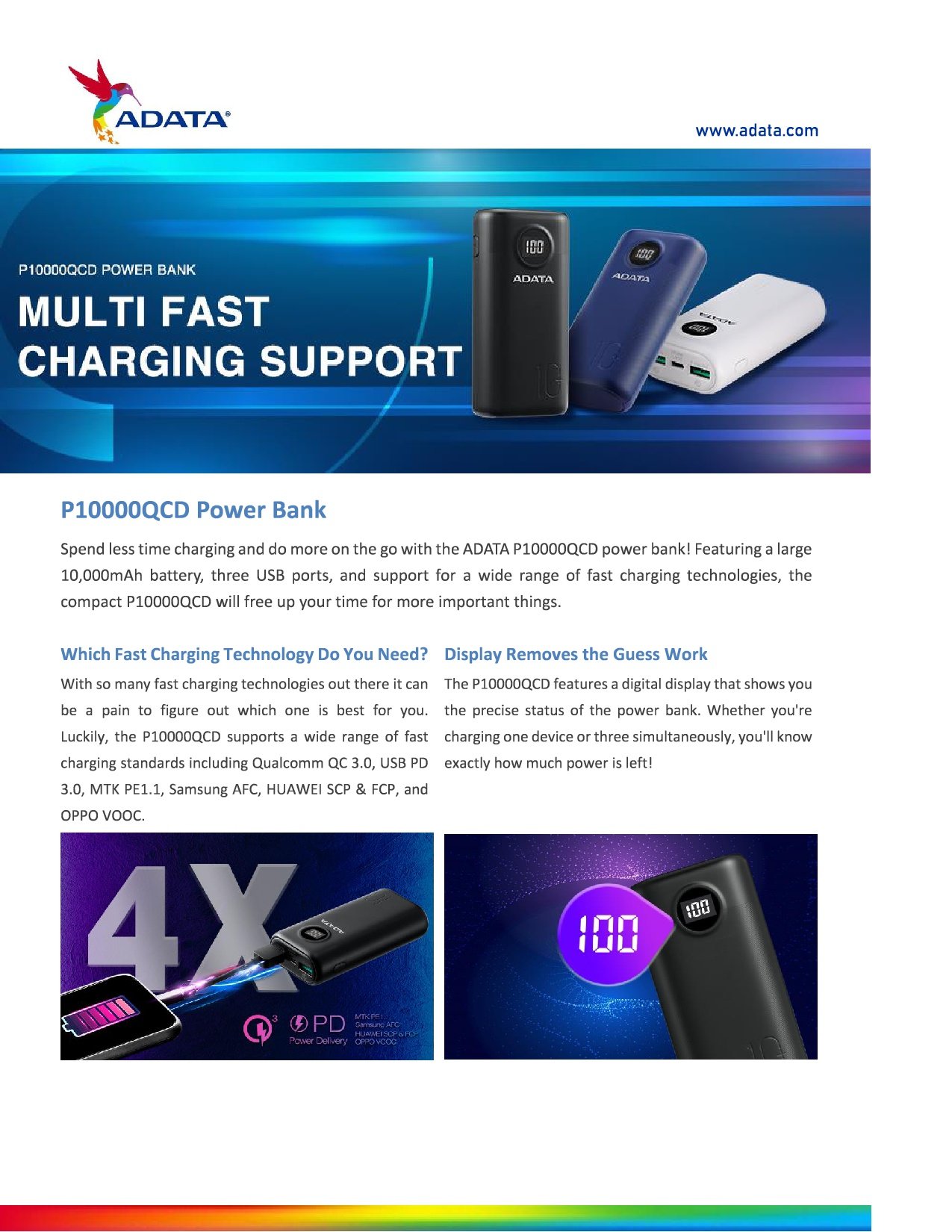 Cargador Portátil Adata P10000QCD- 10.000mAh- Blanco Power Bank CARGA RAPIDA
