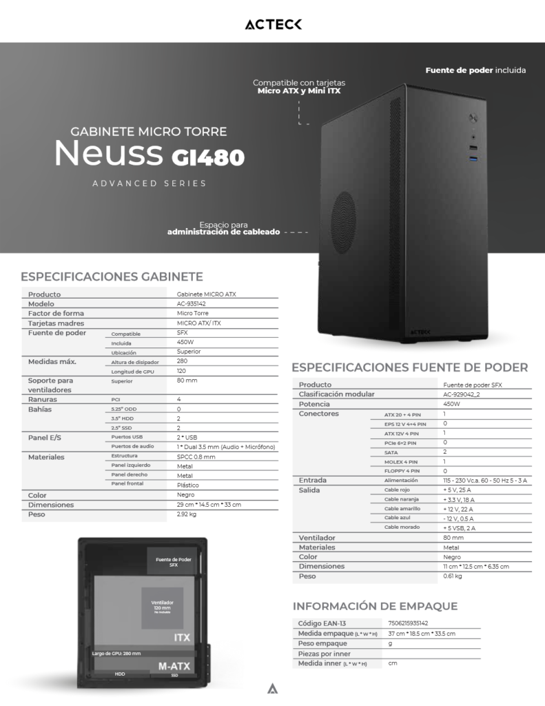 Gabinete Acteck Neuss GI480 sin Ventana- Micro-Tower- Micro-ATX/ITX- USB 2.0/3.0- con Fuente de 450W- sin Ventiladores- Negro