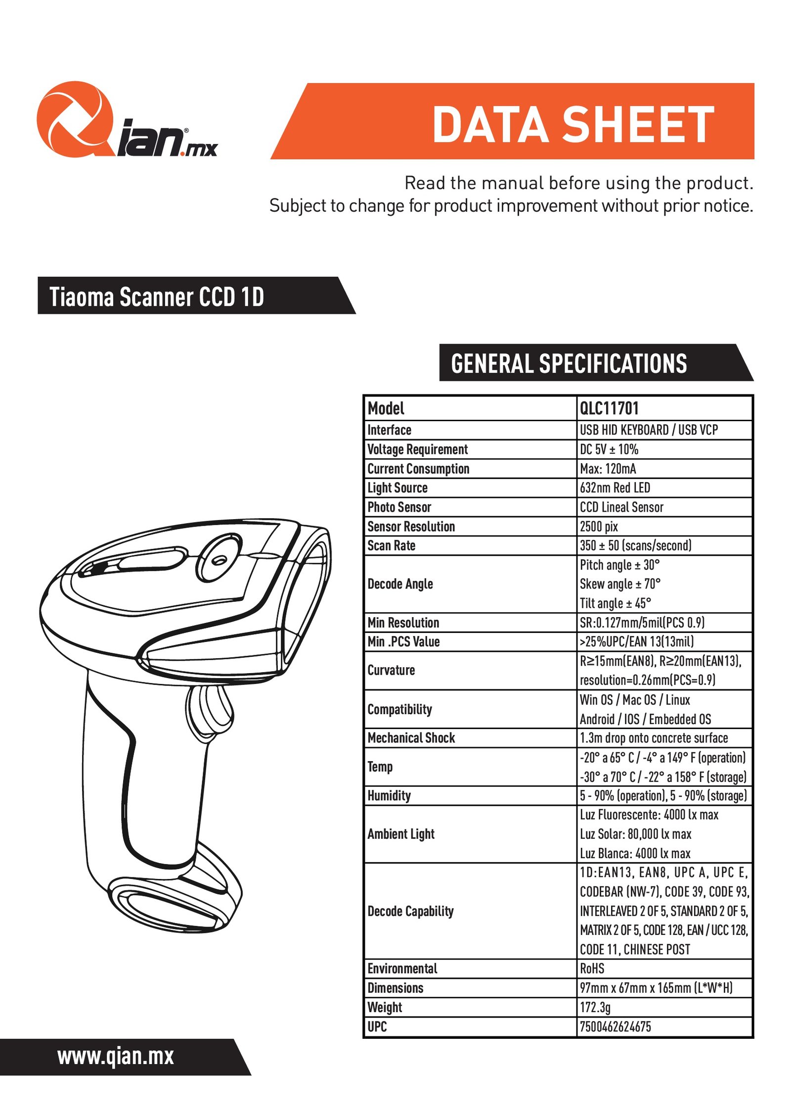 Lector de Código de barras QIAN Tiaoma QLC11701 /350 / 50 escaneos